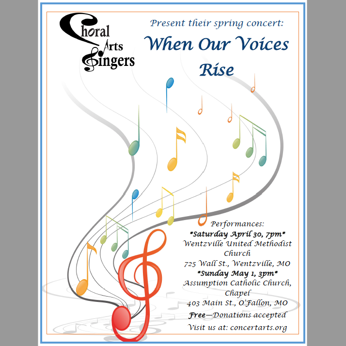 Please visit our website, www.concertarts.org, and Facebook (Choral Arts Singers) for more concert details and to learn more about our choir. We look forward to singing for you again this spring.