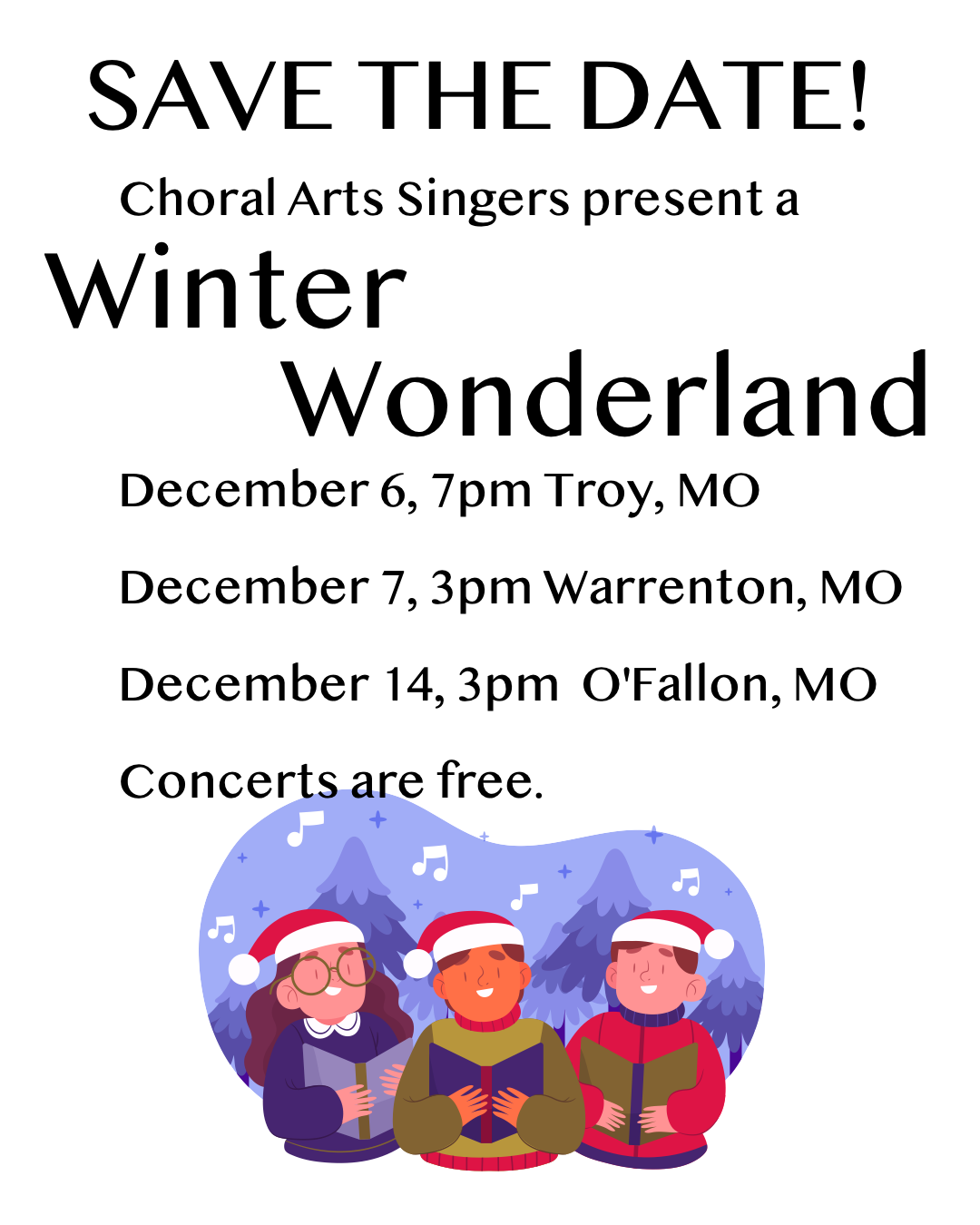 The Choral Arts Singers invite you to our “Winter Wonderland” holiday concerts, featuring the concert title song, the joyous and expansive “Te Deum” by Karl Jenkins, the White Christmas (choral medley), and several beautiful and fun holiday favorites.