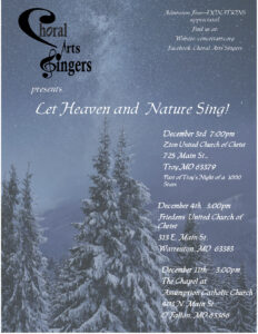 The Choral Arts Singers invite you to join us for our holiday concert, “Let Heaven and Nature Sing”, featuring the gorgeous “Breath of Heaven”, the uplifting “The Heavens Are Telling” by Haydn, and several holiday favorites.